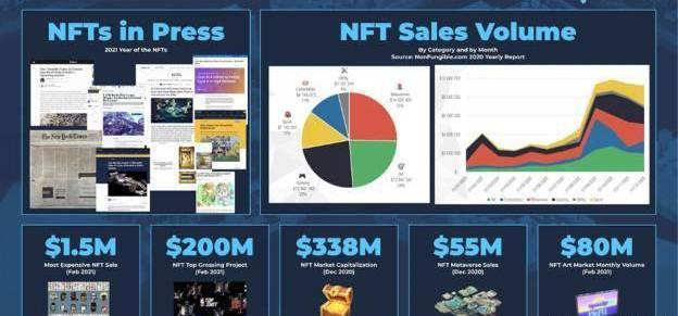 數據來源:TheSandbox僅在2021年2月,NFT藝術市場便擴張到了8000萬美元,而Metaverse(元宇宙)和虛擬LAND也在持續增長,AxieInfinity銷售額達到888ETH,TheSandbox游戲虛擬世界出售了300萬美元的LANDSNFT,超過2019及2020年度總和。