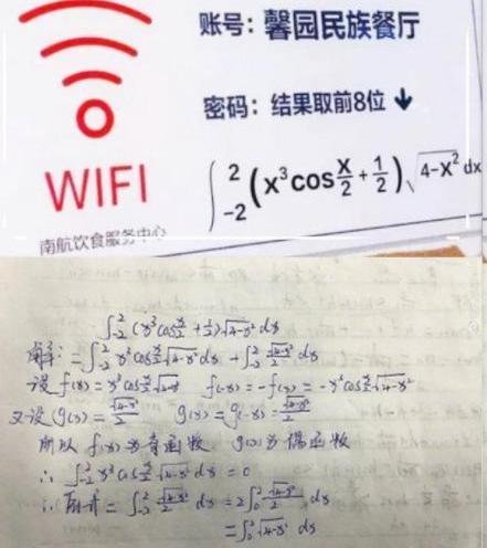 但這所大學則是不走尋常路,是用微積分的題來作為WiFi密碼,而且需要學生自己算出來后才能能成功連上WiFi,也被學生戲稱為“高數”食堂。這個食堂的密碼就是下面這道題答案的前8位。