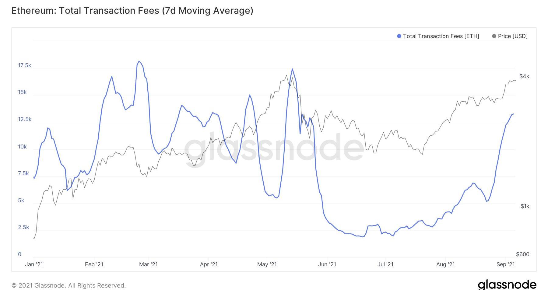 近期以太坊手續費有所上升。根據glassnode的數據,9月5日以太坊最近7天的手續費均值達到了1.33萬ETH,較8月22日創造的短期低點5150ETH上漲超157%,已回到了5月中旬的手續費水平。