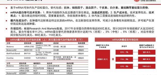 mRNA預防性疫苗有望在2025年503億美元預防性疫苗市場中達到20%滲透率,對應市場規模101億美元;mRNA腫瘤疫苗有望在2025年達到0.5%滲透率,按照2050萬癌癥患者基數,個性化治療腫瘤疫苗全療程10萬美元/人價格計算,對應市場規模105億美元;mRNA蛋白替代療法有望取代部分蛋白藥物市場,按照2025年蛋白藥物市場規模2200億美元計算,假設mRNA蛋白替代療法替代率達到3%,對應市場規模為66億美元;mRNA其他領域應用產品也將陸續上市,包括過敏免疫治療、再生醫學療法、醫美等領域,按照基因編輯再生醫學療法179億美元的市場規模計算,假設mRNA療法滲透率為5%,對應市場規模9億美元。