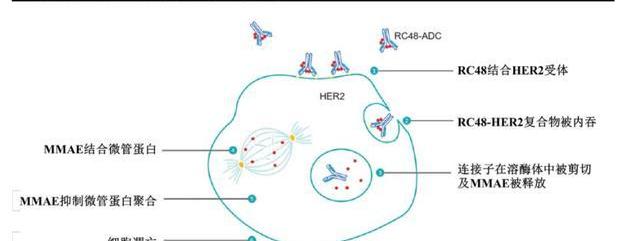 RC48的抗體部分結合至腫瘤細胞表面HER2的胞外結構域后,ADC復合物經細胞內吞并轉運到溶酶體,連接子經酶切后釋放出微管抑制劑MMAE,破壞細胞內微管網絡,導致有絲分裂細胞周期停止和細胞凋亡。此外,體外研究顯示RC48可抑制HER2受體信號,并具有抗體依賴細胞介導的細胞性作用。
