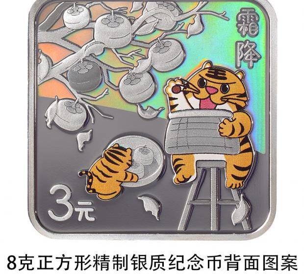 8克正方形銀質紀念幣背面圖案以虎、柿樹為主要設計元素,展現霜降時節采摘柿子情景,并刊“霜降”字樣及面額。