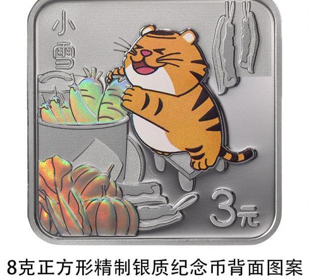 8克正方形銀質紀念幣背面圖案以虎、蔬菜、臘肉為主要設計元素,展現小雪時節“腌菜”“制臘肉”習俗,并刊“小雪”字樣及面額。