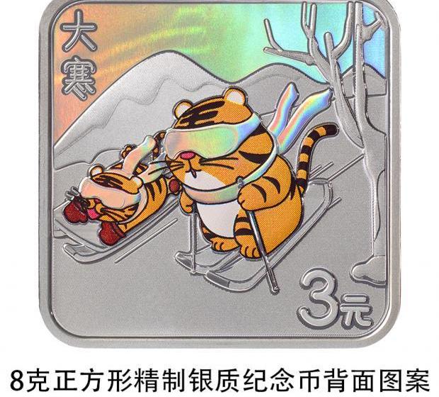 8克正方形銀質紀念幣背面圖案以虎、雪具、雪山為主要設計元素,展現大寒時節滑雪嬉戲情景,并刊“大寒”字樣及面額。