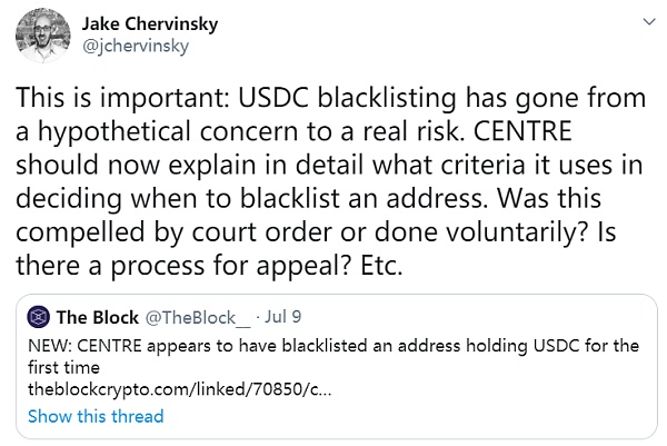 DeFi 新任王者 Compound 的總顧問 Jake Chervinsky 發布推文表示:“USDC 黑名單已經從一個假想的擔憂變成了一個真正的風險。”