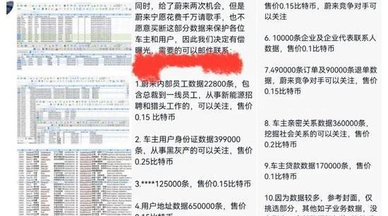 一張流傳于網絡的圖片顯示,有人宣稱破解了蔚來大量數據,并公開叫價出售。其列出的數據涉及蔚來的經營以及客戶隱私,包括蔚來員工數據、訂單數據、用戶及企業代表聯系人數據,還包括車主身份證、用戶地址,甚至車主親密關系、車主貸款數據等極為隱私的信息。