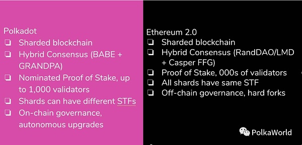 這張圖顯示了波卡和 Eth2.0 的對比,可以一見異同。二者之間最大的區別就是治理,波卡相信快速反應,快速升級,是面向未來的。換言之任何的新技術、密碼學的發展,都可以添加到波卡的鏈上。當然這需要社區投票。也即社區對鏈擁有控制權,它們的決議自動執行。自動執行這一點也很強大, 想象一下,你有一個全球的社區,成員說不同的語言,也不認識彼此,但是可以通過投票的方式,達成共識,并且自動執行。任何個人都無法壟斷。
