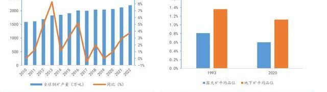 據ICSG、CRU、Woodmac數據統計,全球銅礦山露天礦平均品位已經由1993年的0.81%下滑至0.6%左右、地下礦平均品位已經由1993年的1.36%下滑至1.12%。