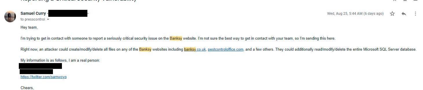 我不知道他們不是同一個人,也不認為他們有任何關系。我很難披露這個漏洞,大概花了一周的時間,向我能想到的所有渠道發送信息,但由于班克斯是完全匿名的,所以真的很難聯系到任何人或他的IT團隊。