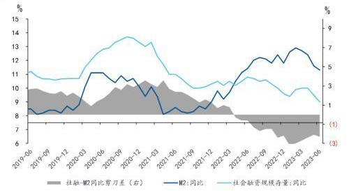 整體看,6月“M2-M1”剪刀差較5月走闊1.3個百分點至8.2%,貨幣活化程度有所降低。6月M2同比增長11.3%,較5月降低0.3個百分點;6月M1同比增長3.1%,較5月降低1.6個百分點。“社融-M2”剪刀差較5月走闊0.2個百分點至-2.3%,流動性循環邊際弱化。