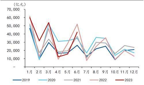 6月人民幣存款新增3.71萬億元,同比少增1.12萬億元。其中,6月新增居民存款、企業存款、財政存款、非銀存款分別為26736、20601、-10496、-3320億元。其中,居民新增存款屬于季節性回升,但仍然超出過往五年的均值水平;企業新增存款同比少增,不過仍處于過往五年的均值水平附近。2023年6月以來,國有大行率先啟動新一輪存款利率調降,后續影響值得關注。