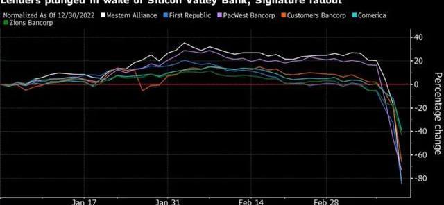 硅谷銀行破產并不是該事件的終結,3月12日,紐約州金融監管宣布關閉資產規模達1100億美元的SignatureBank,美國第一共和國銀行、西部聯盟銀行等等股價均發生暴跌。