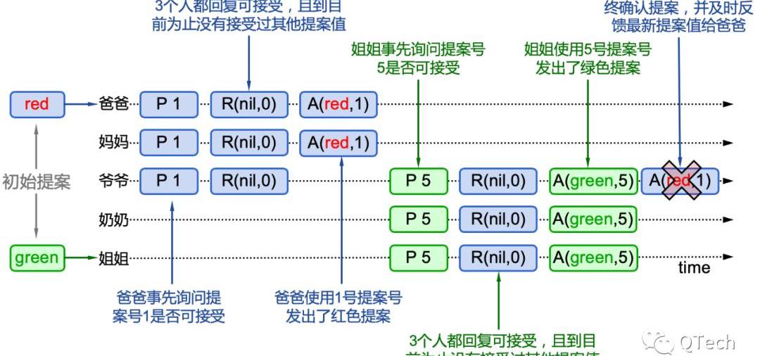 這次,我們只考慮有兩個人發起了提案,分別是爸爸的紅色提案和姐姐的綠色提案。如果爸爸的提案已經獲得了3票的同意達到了選定狀態,隨后姐姐才發起提案,根據每個人都接受所有提案的原則,綠色提案最終也能夠達到選定狀態。顯然,這種方案違背了唯一性的原則,如果一直這樣運轉下去可能最終也沒法選定一個提案值。