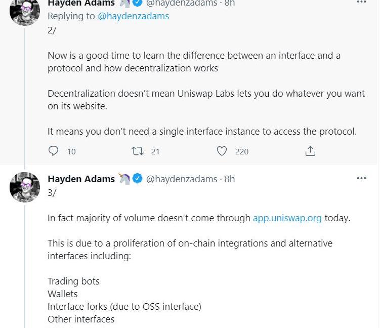 XRP/HKD-2.34%巴比特訊,Uniswap創始人HaydenAdams7月24日發推表示,UniswapProtocol是以太坊上完全去中心化的免許可智能合約;UniswapInterface開源GPL代碼庫;app.uniswap.org是UniswapLabs擁有的域名,指向Uniswap接口的IPFS托管實例。人們需要了解接口和協議之間的區別以及去中心化如何工作。去中心化并不意味著UniswapLabs可以讓用戶在其網站上做任何想做的事情。這意味著用戶不需要單個接口實例來訪問協議。事實上,目前大部分交易量都不是通過app.uniswap.org。這是由于鏈上集成和替代接口的激增,包括:交易機器人、錢包、接口分叉、其他接口、DEX聚合器。