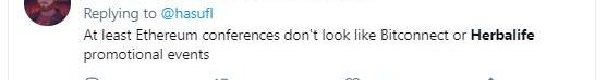 以太坊社區名人AnthonySassano直接將此次大會比作康寶萊傳銷大會。