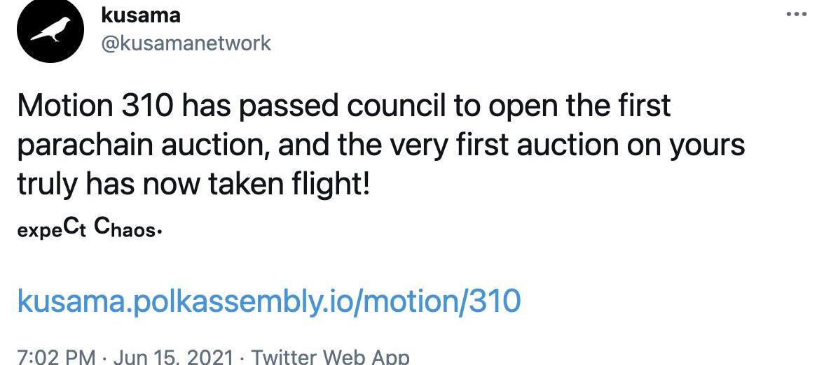 XRP/HKD-2.55%據Kusama官方表示,經投票通過,Kusama首個平行鏈插槽拍賣已啟動。據悉,Kusama的平行鏈拍賣機制將分為5個部分:團隊先上傳他們的平行鏈代碼和相關參數、拍賣期間可以開放競價、拍賣結束的精確時間由VRF確定、競拍成功團隊的KSM將會被鎖定、當平行鏈租賃結束前可以通過另一場拍賣延長租期。數據顯示,Kusama平行鏈插槽拍賣目前已經鎖定541719枚KSM。其中,超36萬枚KSM投票給Karura,8.2萬枚KSM投票給Moonriver,6.6萬枚KSM投票給Shiden。
