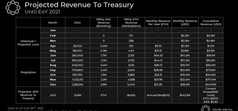 表面上看,你可能認為Axies的供應量目前符合用戶需求,因為每個用戶需要3個Axies才能玩,但是高級用戶和各種收藏家擁有許多Axies。這就是為什么我們認為該比率很有可能保持在3以上,但在未來幾個月逐漸下降。將這一比率與DAU數值結合起來計算,我們就能夠計算出有多少AXS將累積到金庫中。
