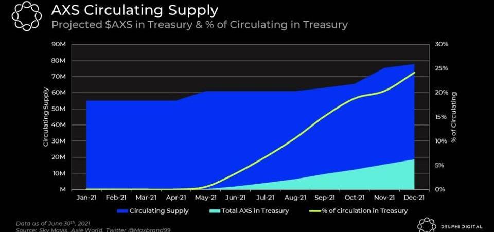 我們估計到今年年底,大約24%的流通AXS將由金庫持有,前提是假設沒有資金從金庫流出。金庫資金的流入來自通過AXS支付的繁殖費用,以及因為35%基于發行的Staking獎勵將直接進入金庫。流通的供應擴張部分來自65%的基于發行的Staking獎勵,這些獎勵回饋給Staker,主要來自不同持有者群體以各種形式逐步釋放的代幣。