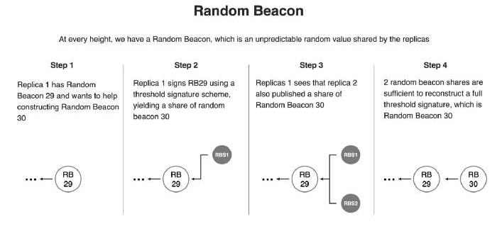 為了最終在區塊鏈上達成協議,我們將通過在協議中添加一些內容:隨機信標,來減少每輪獲得的經過公證的區塊數量。在每個高度,都有一個看起來像是虛擬的隨機數,我們稱其為隨機信標,是一個不可預測的值。