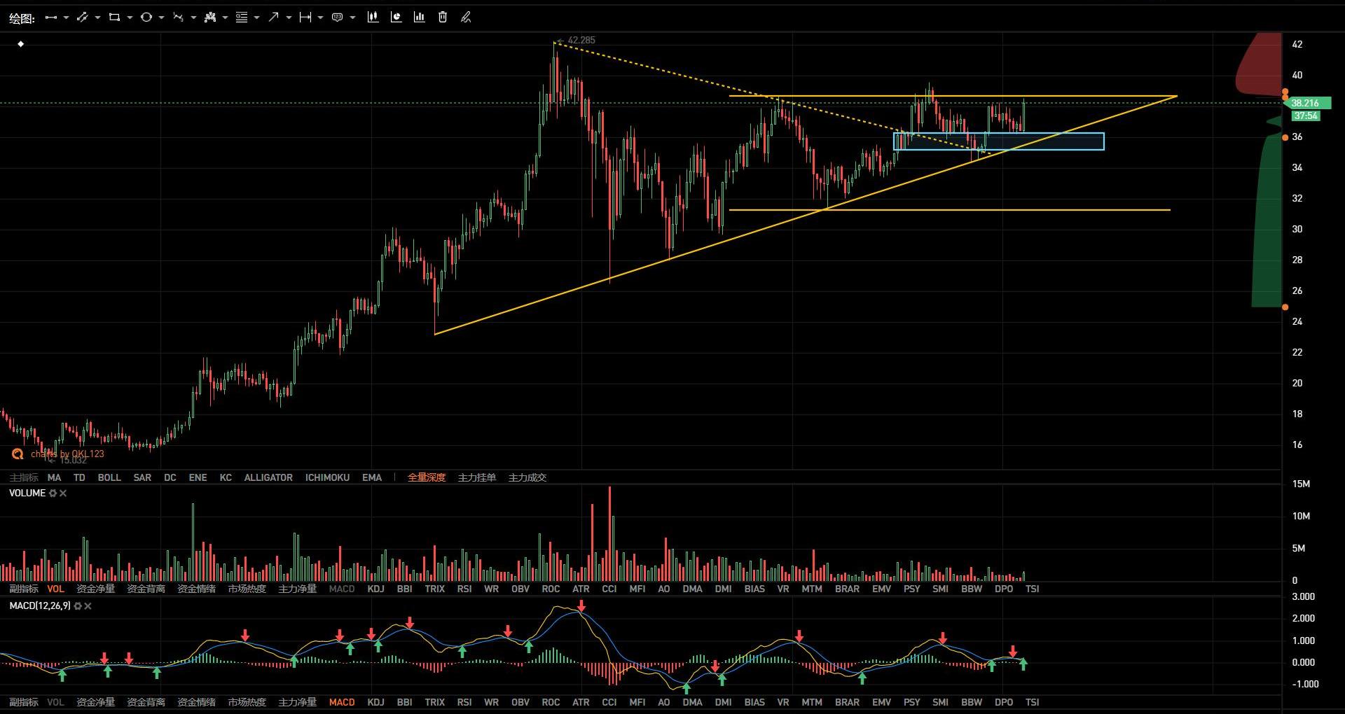 繼前期報告所述,后續關注三角下沿和短期需求區下沿所構成的死角支撐位34.8附近,若得到有效支撐有一定概率突破前高阻力位38.7。如圖所示,自上期報告至今,波卡雖深入短期需求區間內,但于三角下沿和短期需求區下沿共振位置有效止跌,后反彈至前高位置遇阻,當前三探前高。后續關注大盤回補缺口風險,同時關注短期趨勢線即三角下沿,若能得到有效支撐,則目標位仍看至突破前高,反之繼續關注下方32附近。