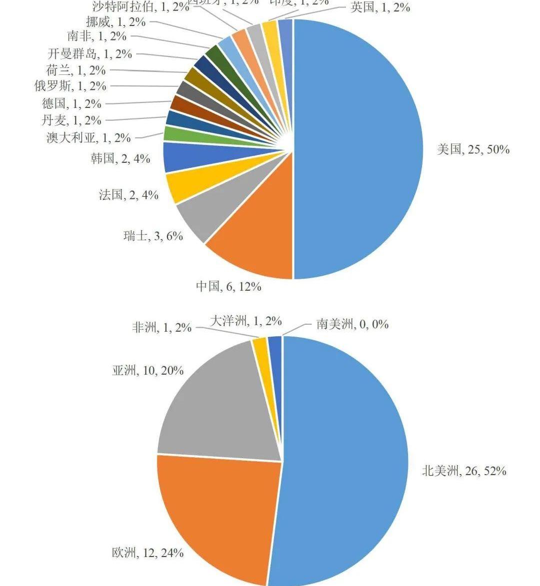 從所在國家來看,美國仍然顯示出強大優勢,共有25家機構上榜,占到了總數的50%,其次是中國、瑞士、法國和韓國,四國共占到了總數的26%;從地區分布來看,北美洲共有26家機構,占到了52%,歐洲和亞洲次之,分別占24%和20%,南美洲沒有機構上榜。相較于前兩次榜單,2019年,50家公司中的33家來自美國,另外13家來自歐洲;2020年,有30家公司來自美國,14家來自歐洲。整體來看,地區分布呈現多樣化趨勢,亞洲國家在區塊鏈領域發展迅速。