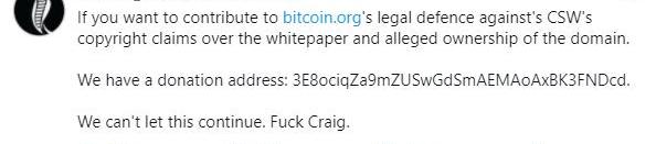 XRP/HKD+1.65%針對Bitcoin.org托管比特幣白皮書一事,Bitcoin.org域名所有者C?bra近日發推呼吁,如果大家想幫助Bitcoin.org與CSW針對白皮書的版權聲明和域名的所謂所有權進行法律辯護,可以發送資金到相關捐贈地址。C?bra呼吁業內公司一起捍衛白皮書。多家加密公司響應其號召,在自己的網站轉載比特幣白皮書。據此前報道,由于CSW提出的侵犯比特幣白皮書版權的指控,有開發者撤下Bitcoin.org官方的比特幣白皮書。隨后Bitcoin.org官方對此聲明,Bitcoin.org擁有托管比特幣白皮書的合法權利,將繼續托管比特幣白皮書,抵制虛假指控。