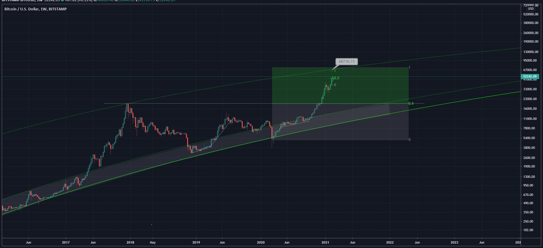 根據Dave的說法,比特幣可能會在68710.15美元的高位上見頂,然后引發大規模修正,這將使其一路回落至上一輪牛市的高點20000美元。