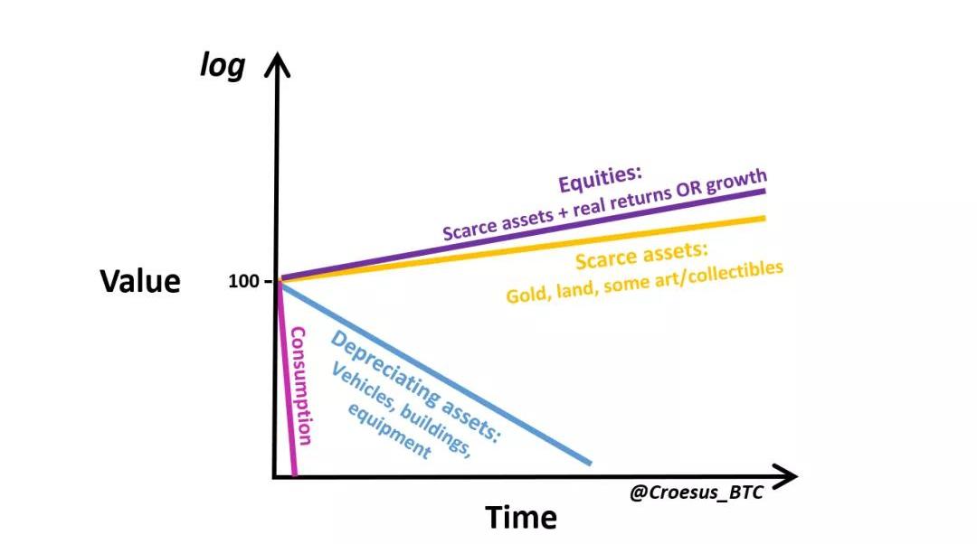 股票:稀缺資產+實際收益OR增長稀缺資產:黃金、土地、一些藝術品/收藏品。貶值資產:車輛、建筑物、設備。消費