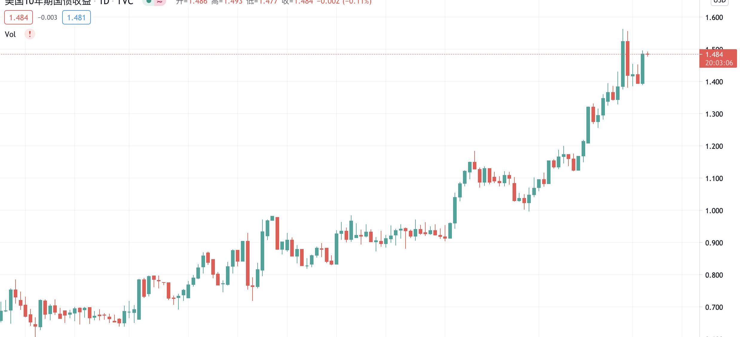 周三美債收益率再度大漲,令股市承壓,10年期美債收益率漲逾10基點,日內一度逼近1.5%。業內人士稱,美債收益率與股市通常存在一定的“蹺蹺板”效應。當美債收益率提高時,資金會更多流向債市尋求無風險回報率,股市存在一定調整壓力。分析人士預計,美債收益率上行趨勢猶存。
