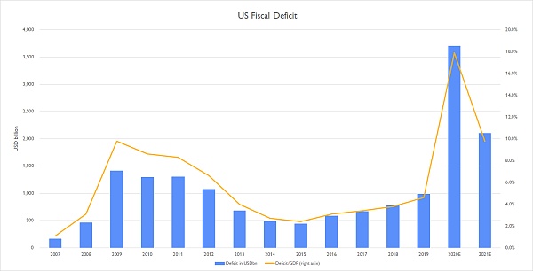 美國國會預算辦公室預測未來幾年仍將出現產出缺口,因此聯邦政策將繼續支持美國經濟。這意味著,除非經濟迅速反彈,否則美國的貨幣政策不會收緊。今年的財政赤字預計將升至GDP的18%左右,接近戰時的紀錄。正如之前的insight文章所探討的那樣,擴張性貨幣政策將極有可能繼續支撐包括數字資產在內的實物資產的價格。