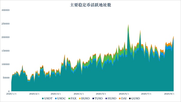 USDT、USDC、PAX、TUSD、DAI的持幣地址數分別上升38624個、7331個、269個、885個、5683個。