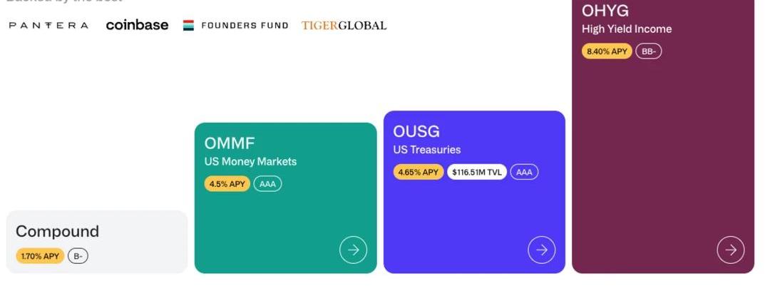 其中,OUSG錨定美元穩定幣,由短期美國國債作為抵押品,最初通過貝萊德美國短期國債ETF(SHV)進行,收益率預計為4.65%?;OSTB將投資于短期投資級公司債券,最初通過PIMCO增強型短期到期主動型ETF進行,收益率為5.45%?;OHYG將投資于高收益公司債券,最初通過貝萊德iBoxx高收益公司債進行,收益率為8.02%?。債券投資者可以通過智能合約批準的代幣化基金權益凈值進行鏈上轉讓,OndoFinance將收取每年0.15%的管理費。