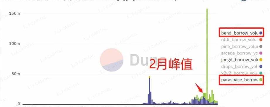 Paraspace上線以來由于其U本位借貸功能、Ape借貸與自動復利的推出在NFT借貸賽道下行的趨勢下獲得了較好的成績,成為Benddao有力的競爭對手。2月中旬以來,NFTU本位價格不斷下跌,ETH的價格卻不斷上漲,這使得用戶抵押NFT借出ETH相較于借出USDT承擔了更大的虧損;Benddao之前只提供ETH的借貸,而Paraspace在提供ETH借貸的同時也提供了USDT的借貸,多元化的產品結構在目前的市場環境下為其捕獲了大量TVL。