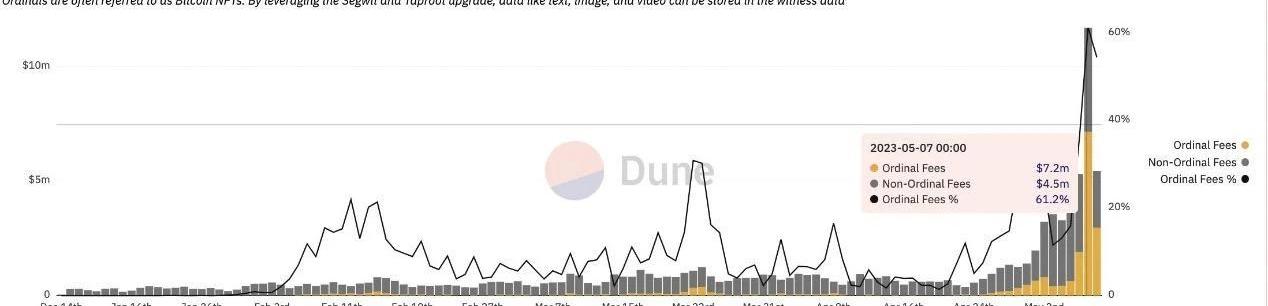 昨日,繼在5月1日比特幣鏈上日交易量達到創紀錄的60.5萬筆后,鏈上單日交易量再創新高,達到了66.3萬筆。而目前,比特幣網絡上,包含部署/鑄造/轉賬在內的?BRC-20?協議相關交易量已經超過了非Ordinals協議交易量。5月7?日,BRC-20協議交易量一度占比超65%?。
