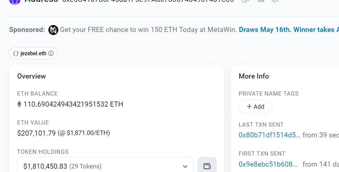 這條巨鯨看起來很無情,“會殺死小魚”。5?月?8?日,該地址在單筆交易中賣出了價值?20?余萬美元的?BEN,并于?5?月?10?日又在多筆交易中進一步賣出了價值近?9.7?萬美元的?BEN。