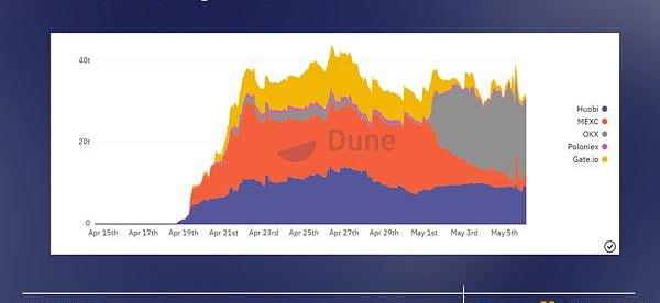 根據統計,PEPE在Huobi、MEXC、OKX、Poioniex和Gate.io這5家交易所的持有余額以及每小時的流入流出情況。結合以下三個數據來看,上線之初,交易以Huobi交易所為主,之后各交易所交易量逐漸增多。從5月2日開始,OKX持有的PEPE開始逐漸增多,持有量已超越其他4個交易所,流入流出量也逐漸增加。Huobi和Poloniex的流入流出逐漸減少。