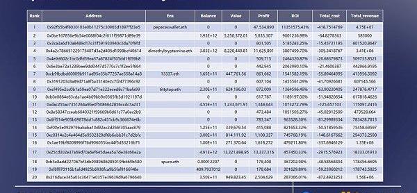 按照ROI排名,列舉了以下20個持有PEPE地址的收益情況。其中PEPE的官方錢包地址排名第一,利潤達到4753萬美元。排名第二的地址中有1.9T枚PEPE,利潤達到5M美元。