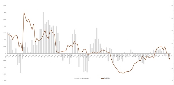 將比特幣7日收益率與BVC情緒指數畫在同一張圖中,不難發現由于比特幣日均收益率的降低,情緒指數與波動隨之降低。說明投資者情緒平穩,在主流幣上的投機情緒不是很重,也側面說明近半月的市場關注度不在比特幣等主流幣種上。