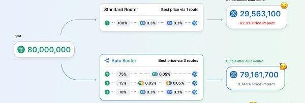 智能路由。和1inch類似,SyncSwap也支持智能路由的功能。智能路由是指,由于AMM池都是兩兩一對的,如果你想交易的兩個幣種,沒有直接的交易對,智能路由功能可以自動幫你選擇多個線路,分散地轉移資金,以實現滑點最小,具體實例圖示如下。在SyncSwap中,智能路由只能支持自己項目的池子,并且可以跨越不同AMM模型的池子。