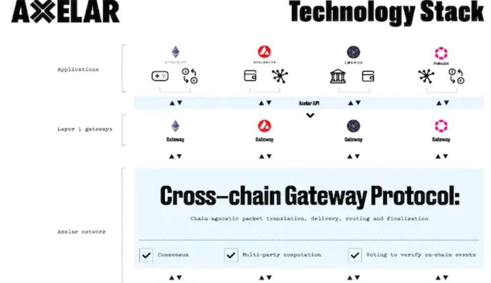 Axelarnetwork?本身是一條基于?Pos?共識的L1區塊鏈,Axelar?由去中心化網絡的驗證人、安全網關合約、統一翻譯、路由架構以及一套適用于協議和應用的編程接口組成。