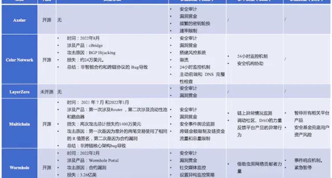 參考文獻:https://axelar.network/blog/an-introduction-to-the-axelar-networkhttps://axelar.network/blog/security-at-axelar-corehttps://docs.axelar.dev/learn/securityhttps://celer.network/technology#tophttps://twitter.com/CelerNetworkcn/status/1560911682339508224?https://mp.weixin.qq.com/s/SInU_o3Ct-7A6pFbKLqzHQhttps://blog.celer.network/2023/03/21/brevis-a-zk-omnichain-data-attestation-platform/https://layerzero.network/pdf/LayerZero_Whitepaper_Release.pdfhttps://drive.google.com/file/d/1NFFFecAjStbGMyvJVDez3xmsGSHYvNYv/viewhttps://medium.com/multichainorg/detailed-disclosure-of-multichain-security-policy-bde0397accf5https://medium.com/multichainorg/multichain-contract-vulnerability-post-mortem-d37bfab237c8https://drive.google.com/file/d/1ibuHChcYcYCN6JelRAQPnM4rkaB9EgAM/viewhttps://github.com/wormhole-foundation/wormhole/blob/dev.v2/SECURITY.md#3?rd-party-security-auditshttps://wormholecrypto.medium.com/wormhole-incident-report-02-02-22-ad9b8f21eec6https://medium.com/@wormholecrypto/wormhole-security-program-end-of-year-update-212116ecfb91