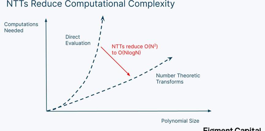 這種方法被稱為直接評估,也是多項式的典型評估方式。問題是,直接求值的計算成本很高——它需要N2次運算,其中N是多項式的度數。因此,雖然這對小的多項式來說不是問題,但在處理大的算術電路時,直接評估會變得非常大。NTT解決了這個問題。通過利用非常大的多項式評估背后的模式,NTT可以評估一項多項式,只需進行N*log(N)計算。