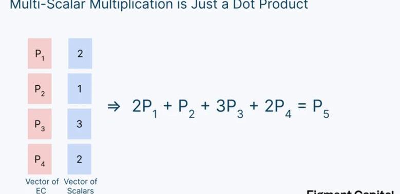 這種將多個橢圓曲線點,與標量相乘,然后相加,得到橢圓曲線上的一個新點的操作稱為多標量乘法。MSM是ZKP生成中最重要的操作之一,然而它只是一個點積。