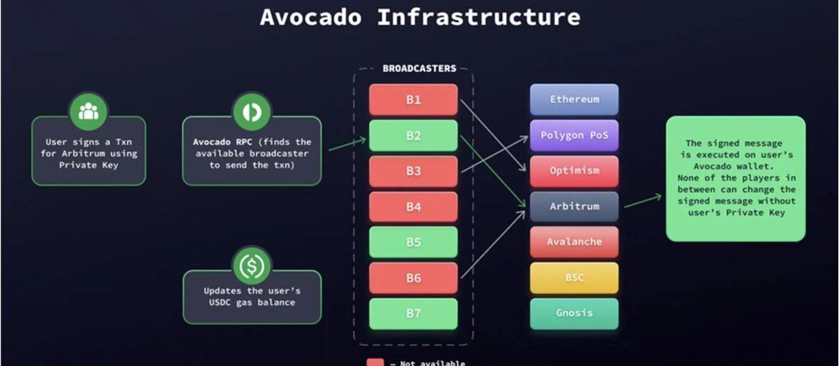RPC網絡找到一個可用的廣播者,將用戶的交易請求發送到區塊鏈。如果請求中加密的信息與用戶的私鑰匹配,則在鏈上確認該交易。通過擁有自己的RPC/廣播者網絡,Avocado可以作為用戶、dapp和底層區塊鏈之間的中間人。