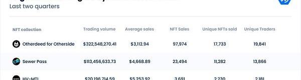 在過去的兩個季度里,BAYC一直保持著在所有NFT項目中最高的交易量,平均售價為100,675美元。該NFT的交易者平均交易3.52筆。