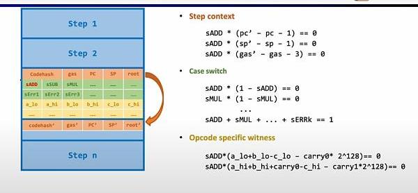 深入EVM電路細節,每一步執行蹤跡都有對應的電路約束。具體來說,每一步的電路約束包含StepContext,CaseSwitch,OpcodeSpecificWitness。StepContext包含執行蹤跡對應的codehash,剩余gas和計數器;CaseSwitch包含所有的操作碼,所有的錯誤情況,以及該步的相應操作;OpcodeSpecificWitness包含了操作碼所需的額外見證,例如運算數等。