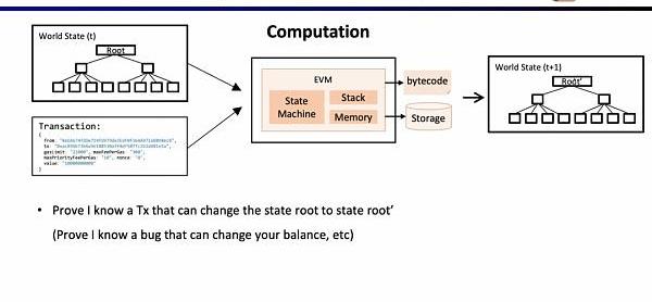 接下來,我們看zkEVM的完整流程,基于初始的全局狀態樹,一筆新的交易進來后,EVM會讀取存儲和調用的合約的字節碼,根據交易生成相應的執行蹤跡例如PUSH,PUSH,STORE,CALLVALUE,然后逐步執行更新全局狀態,得到交易后的全局狀態樹。而zkEVM是將初始的全局狀態樹,交易本身,以及交易后的全局狀態樹作為輸入,根據EVM的規范,來證明執行蹤跡的執行正確性。
