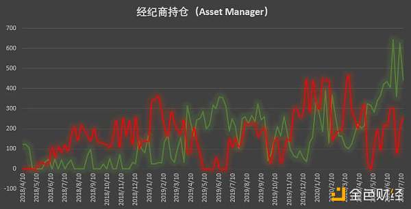 分項數據上來看,規模較大的經紀商持倉多頭頭寸自 626 張回落至 444 張,空頭頭寸自 203 張進一步上升至 255 張。這類賬戶在最新統計周期內進行了過去相當長的一段時間里并不多見的凈空調倉,此前即使是在 BTC 價格持續回落的過程中這類賬戶在多數情況下也基本會保持多空雙向同步調倉或者持續加碼做多,但是最新統計周期內在行情基本保持原地踏步的情況下這類「多方擁躉」進行了明確的凈空調倉比較令人意外。不過考慮到大型機構對于市場風向的敏銳程度,這或許可以視作是機構對于短期幣價深度回調的風險預警。