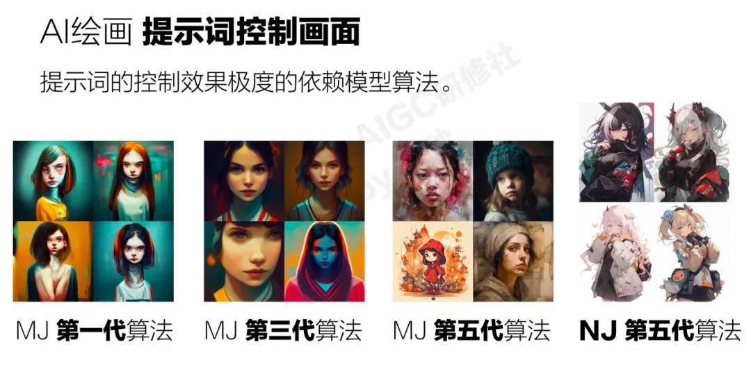 下面這幾張圖是同一提示詞在midjourney不同模型算法的下的生成結果。我這里只使用了一個單詞女孩。我們可以看到在初代版本的人物生成結果是非常差的,這個跟早期discodiffusion的效果類似。我記得去年4五月份還有很多人去花了大量時間研究怎么寫提示詞和調整參數讓DD來畫出一個像樣點的人物圖。