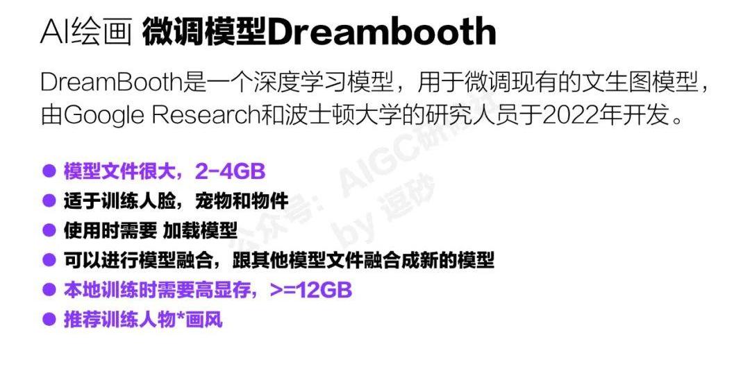 前面這兩種方法其實對于精準生成特定的物體效果都不太理想。dreambooth其實是目前為止最能穩定生成特定人或者物的微調模型。比如你有一個產品需要訓練模型,dreambooth是最能讓每個產品的細節特征都復現的。而且它不需要太多的數據集就可以訓練,前面兩種動不動就是幾十張上百張的數據,它都不需要,dreambooth最少使用3~5張圖就可以了。